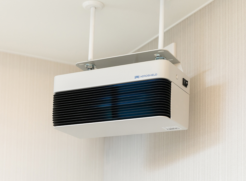 エアロシールドは、高い浮遊菌除去力効果を持つ紫外線ランプ(UVC)を使用した紫外線照射装置です。